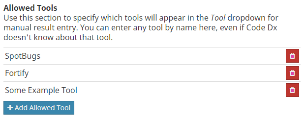 The Allowed Tools section lets you define which tools will appear in the Tool dropdown in the Manual Result form. The names you add to this list do not necessarily need to correspond to a tool known to Software Risk Manager, or even a real tool, for that matter; you can enter any tool name you want. To add a name to the list, click the Add Allowed Tool button, fill in a name, and click OK. To remove a name from the list, click the red delete button to its right. Unlike the Detection Methods delete, you don't need to pick a replacement to delete an item in this list; this list only controls which tools are available when creating a new manual result, not which tools exist.