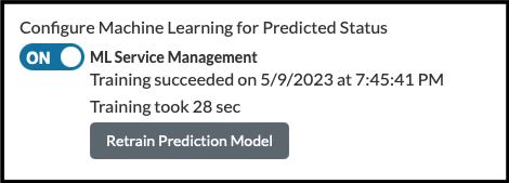 When ML Service Management is off, Software Risk Manager will begin training a prediction model when the Retrain Prediction Model button is clicked. This will transition the section into a On state.